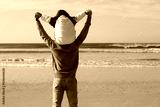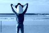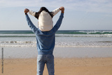 Back view of Japanese family walking on beach together. Daughter riding on fathers back on sunny day, looking at water. Leisure, vacation, parenting concept