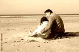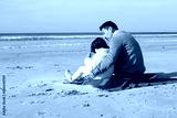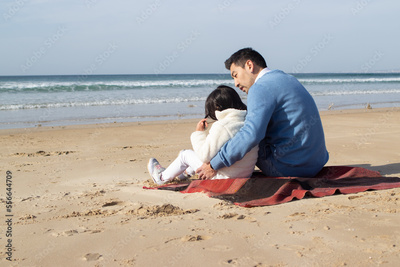 Happy Japanese family on blanket on beach. Father and daughter in casual clothes sitting on blanket, hugging. Family, relaxation, nature concept