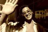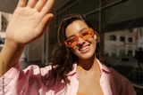 Positive young caucasian woman looking at camera smiling shaking hand outside. Model with brunette hair wears pink shirt and orange sunglasses. Concept of positive emotions.