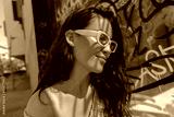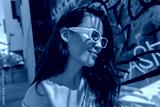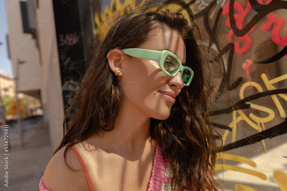 Close-up of pretty young caucasian girl looking away stands outside during spring sunny day. Brunette wears vest, top and sunglasses. Concept of good mood.