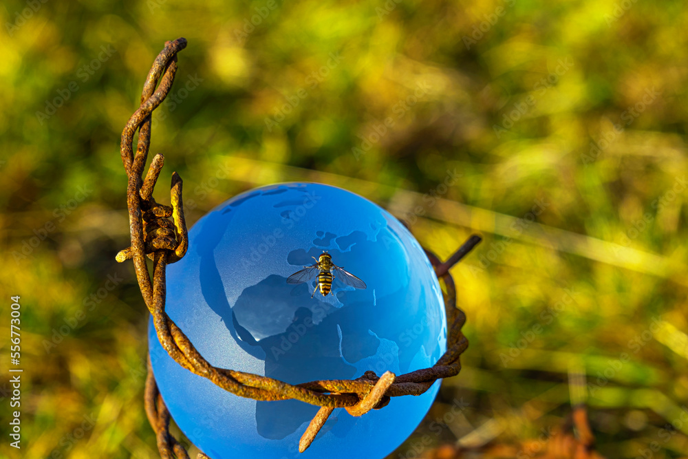 The concept of symbolism. On a green grass is a glass globe, which is surrounded by rusty barbed wire