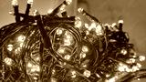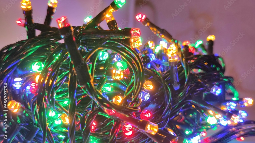 Electric Christmas LED garland. A long electric wire wound into a ball with many LEDs. They light up in different colors. The LEDs are covered with round transparent washers that amplify the light.