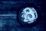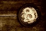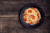 Delicious spaghetti pasta with prawns and cheese served in a black bowl on a black background table Italian recipe, tomato sauce, vegetables, and spices top view with copy space