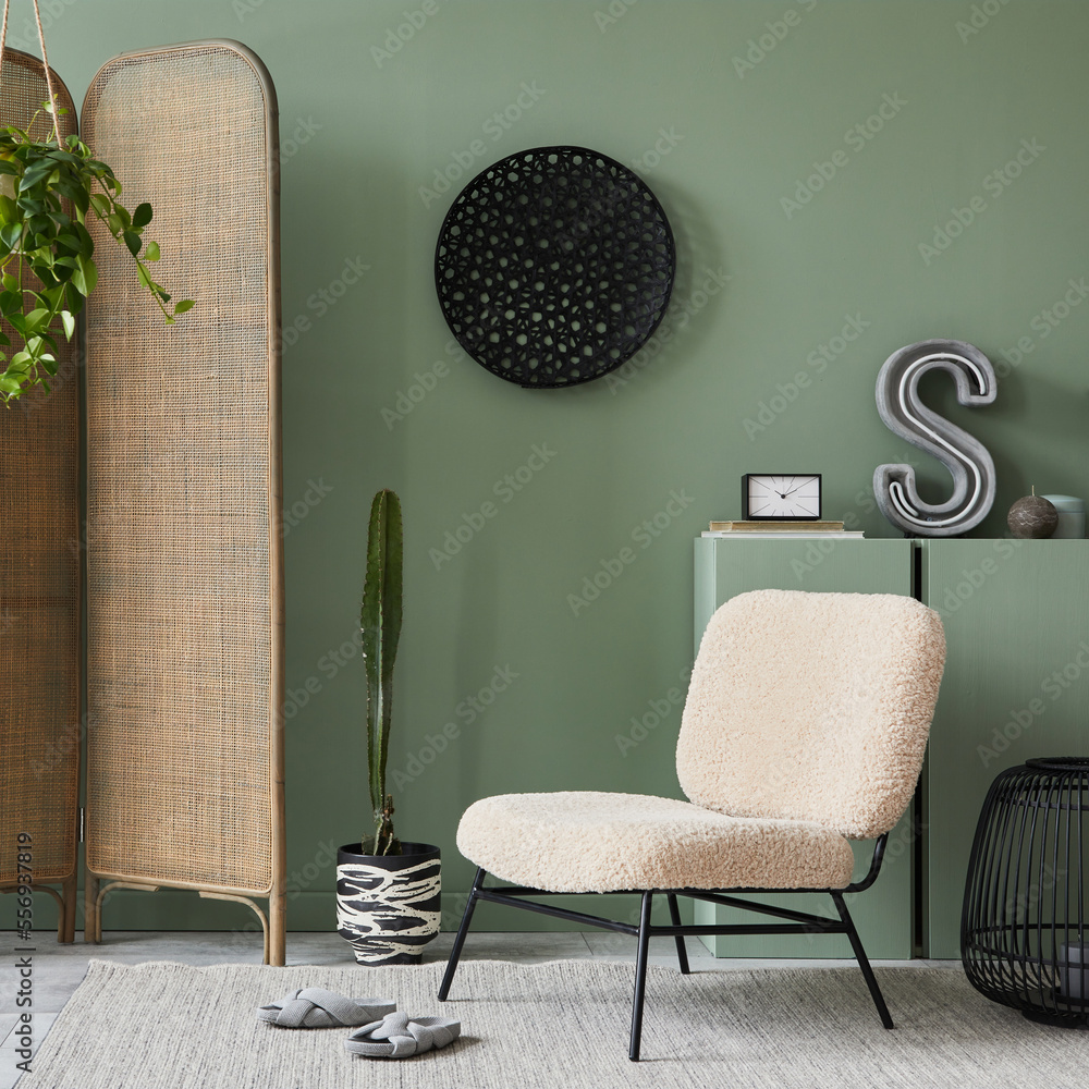 Creative living room interior composition with frotte armchair, folding screen, wooden commode and modern home accessories. Sage green wall. Template. Copy space. Real photo.
