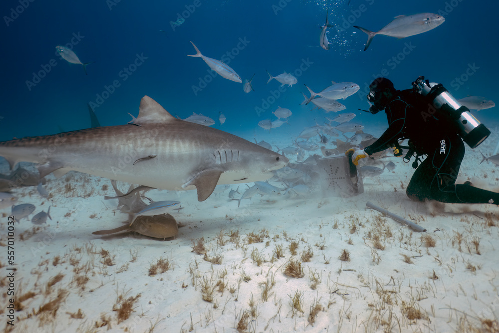 Divers interacting with a Tiger Shark (Galeocerdo cuvier) in Bimini, Bahamas