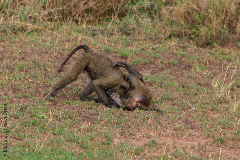 Two young olive baboons (Papio anubis) playing in savanna in Serengeti national park, Tanzania