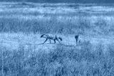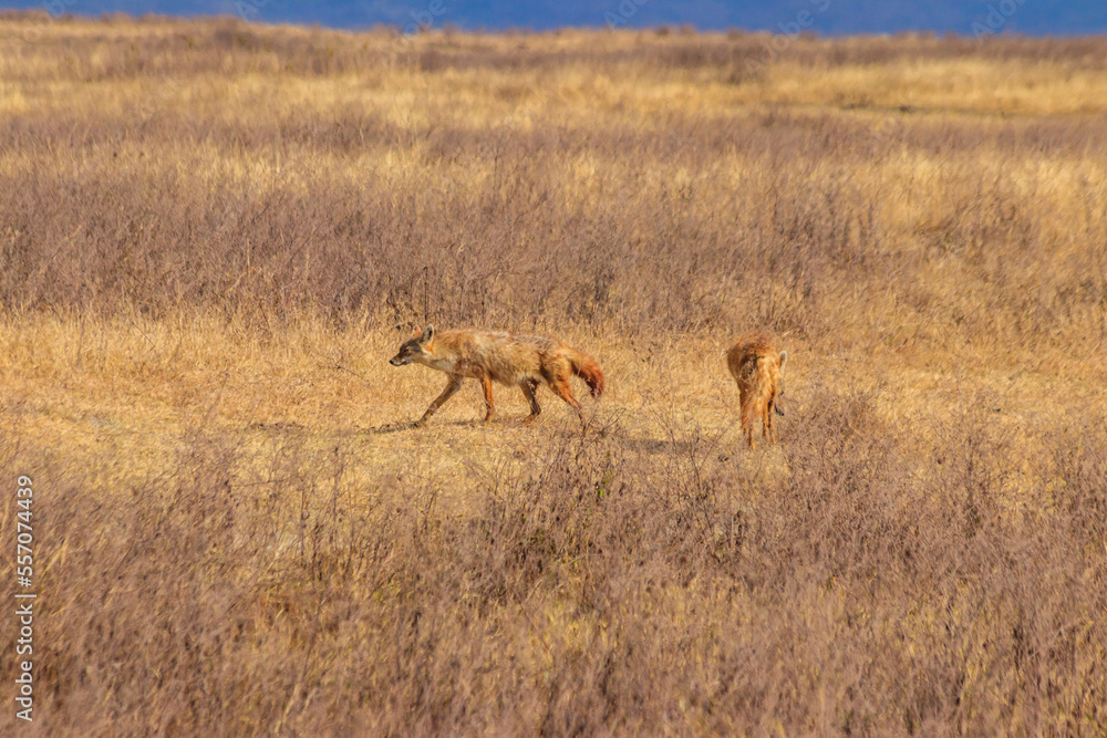 Two jackals walking in dry savannah in Ngorongoro crater national park, Tanzania