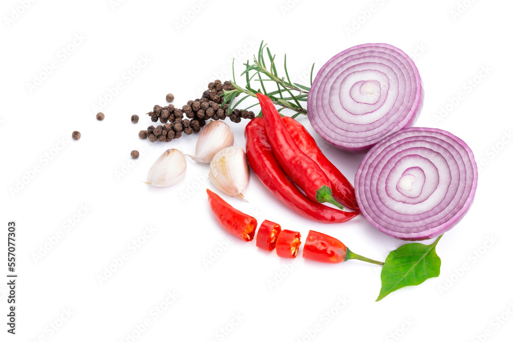 Composition of various herbs and spices vegetables rosemary pepper onion, garlic, fresh red chili, and garden mix for healthy food. isolated on white background, top view