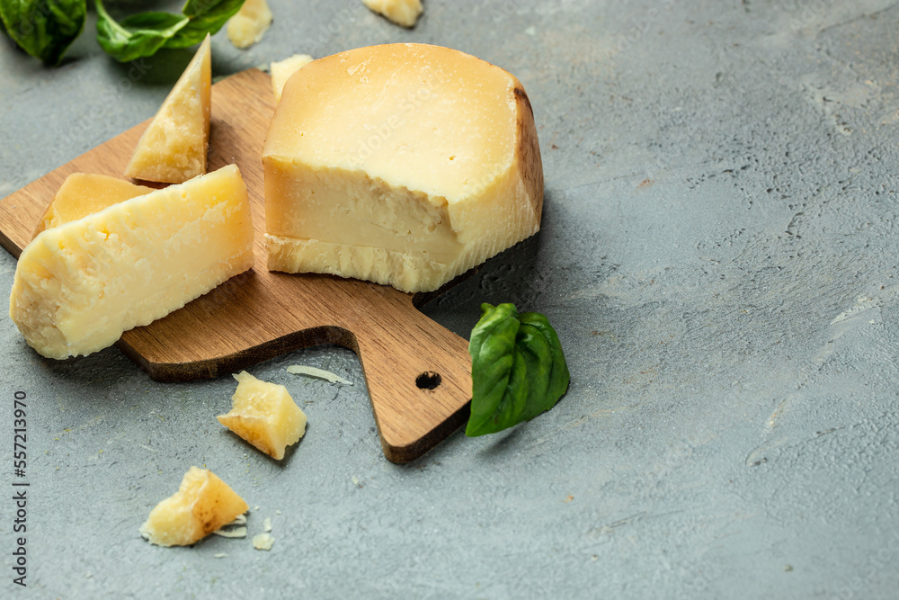 gruyere hard yellow cheese. a traditional Swiss hard yellow cheese without holes, with a dark crust and a pleasant floral and nutty aroma, place for text, top view