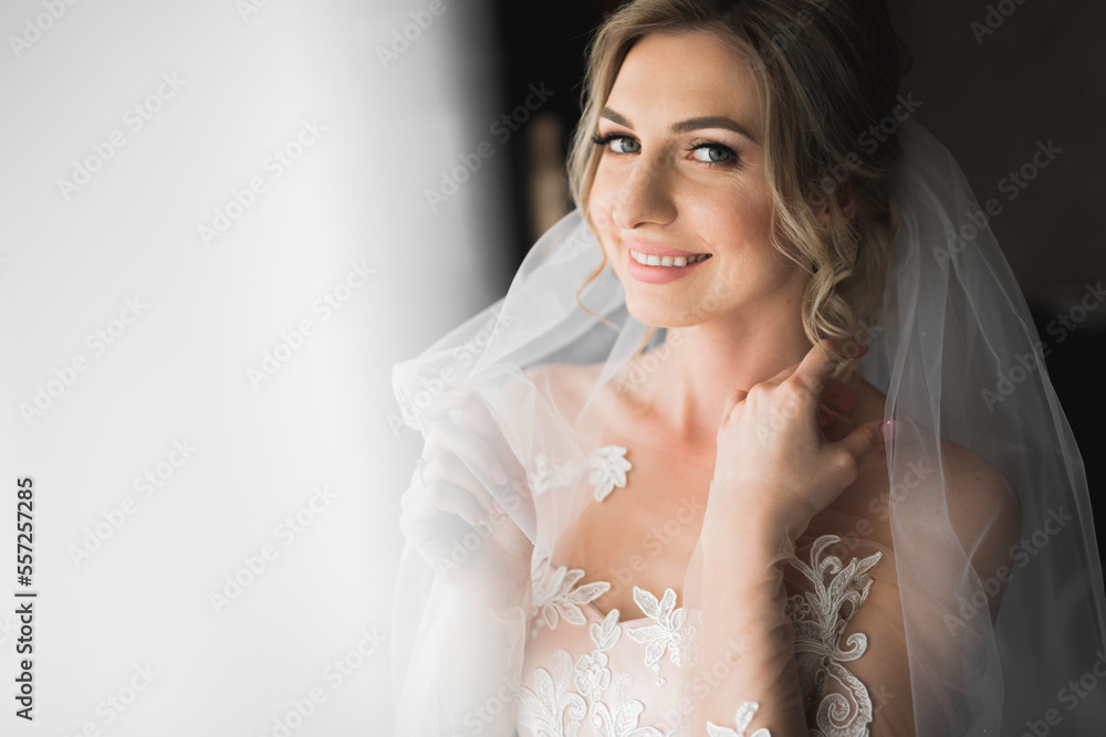 Beauty portrait of bride wearing fashion wedding dress with feathers with luxury delight make-up and hairstyle