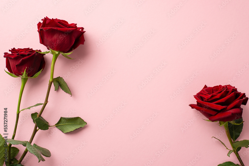 Valentine's Day concept. Top view photo of red roses on isolated pastel pink background with copyspace
