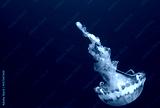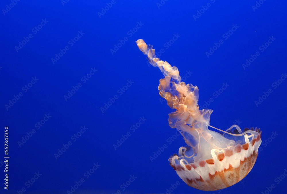 Closeup wildlife of Lonely red Jellyfish underwater blue sea texture background at the Monterey Aquarium - california , united states of america ( USA ) or call Chrysaora hysoscella jellyfish
