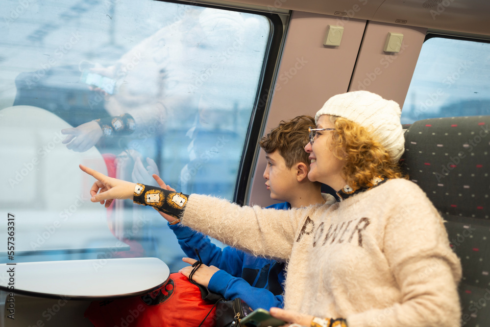 an adult woman and her son look out the window of a train