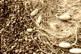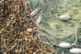 Isolated view of industrial fishing nets seen on a pebble beach together with their floats.