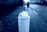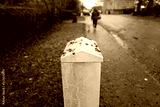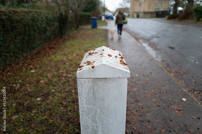 Shallow view of a newly installed Internet telecoms street cabinet in a village setting. A passer by is seen walking her dog.