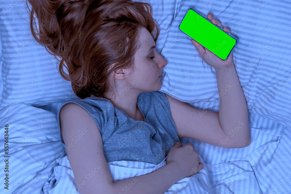 Woman with smartphone green screen in bed at home or hotel in the darkness. Lady relaxing in a nightgown. Girl wearing nightie on clean white bedding, cozy blanket