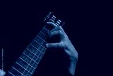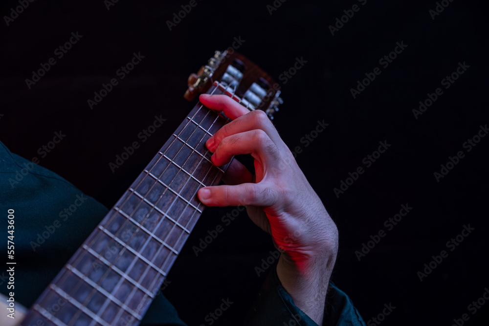 The guy in the dark shirt is plucking the strings of a six-string guitar