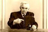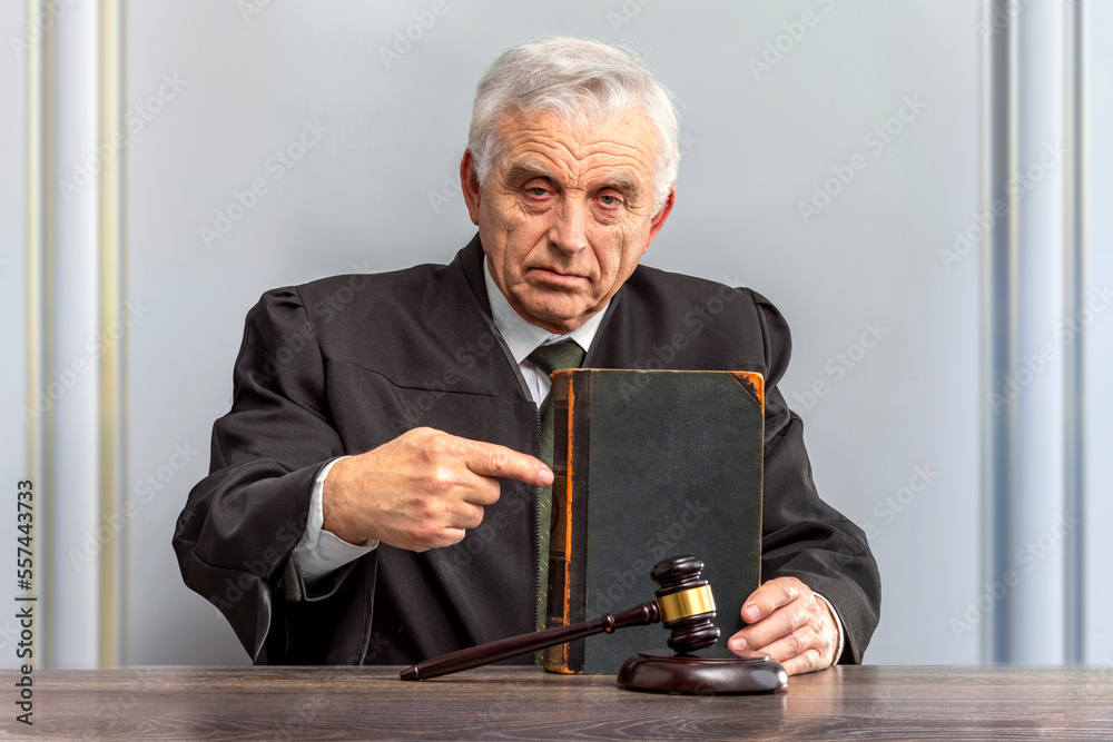 Judge pointing a vintage law book, judge's gavel on the table. Law Lord wearing gown using a hammer for attention and verdict, justice judgment at courts of law