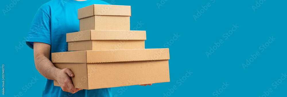 Delivery man with a box. Courier in uniform t-shirt service fast delivering orders. Young guy holding a cardboard package. Character on isolated background for mockup design