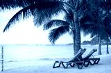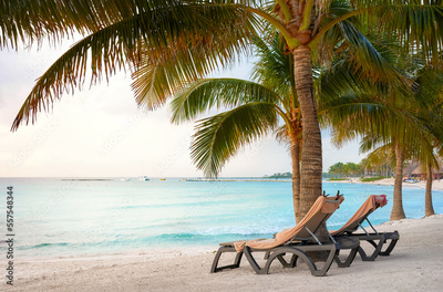 Sun beds under coconut palm trees, Mexico Caribbean coast.