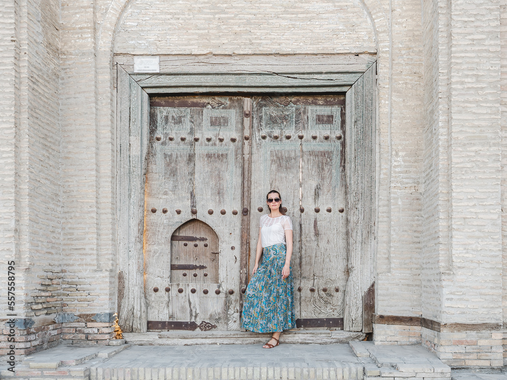 Beautiful young woman against the backdrop of landmarks and ancient buildings. Sights of ancient cities of Uzbekistan. Clear, sunny day. Vacation and travel concept