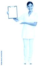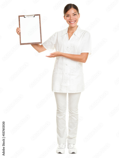 Nurse showing blank clipboard sign - a medical concept. Woman doctor / nurse smiling isolated cutout PNG on transparent background in full body. Mixed race Caucasian / Chinese Asian female model.