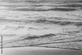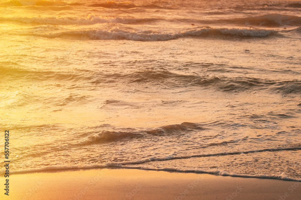 Sunset above sea. Riplpe sea ocean water surface with small waves. Ocean water foam splash washing sandy beach.
