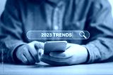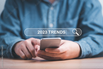 Businessman using smartphone to input keyword of 2023 trends inside infographic searching tool bar for marketing monitor and business planing change concept.