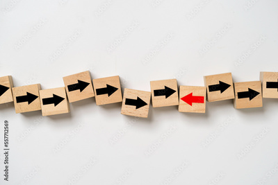 Red arrow move in opposite direction from black down arrow for business disruption and leadership concept.