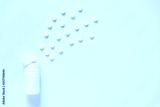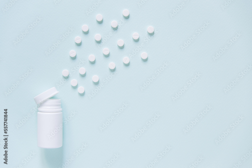 Scattered white pills on blue table. Mock up for special offers as advertising, web background or other ideas. Medical, pharmacy and healthcare concept. Copy space. Empty place for text or logo
