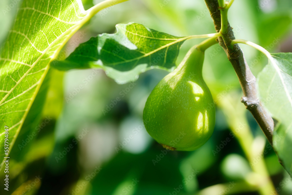 Kadota fig hanging from a fig tree branch in sunlight