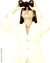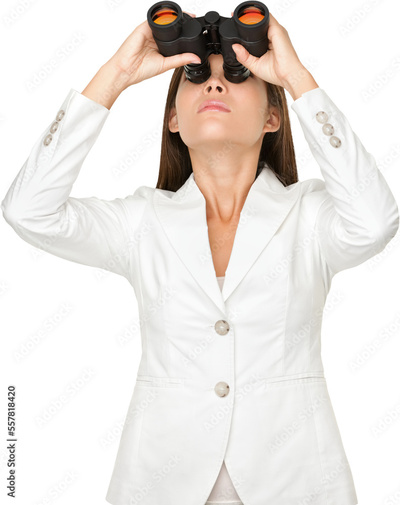 Young businesswoman looking through binoculars isolated on white background. PNG, transparent isolated cutout, Can be superimposed on other image or background.