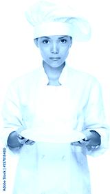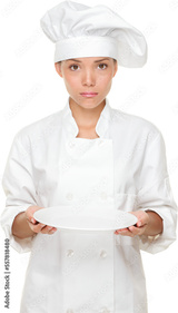 Chef disappointed and sad with empty plate. Woman chef serving empty plate looking negative and funny. Multicultural Asian Caucasian woman chef. PNG, transparent isolated cutout, Can be superimposed o