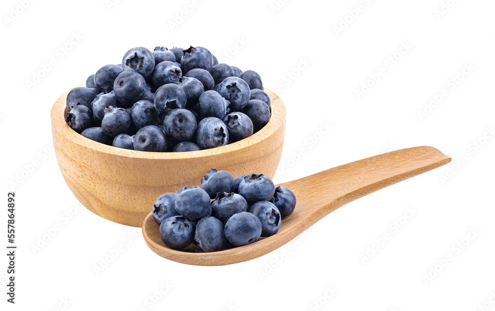 Blueberries in wood bowl and spoon isolated on transparent png