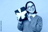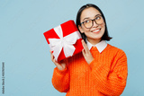 Young woman of Asian ethnicity wear orange sweater glasses hold red present box with gift ribbon bow look aside on area isolated on plain pastel light blue cyan background. People lifestyle concept.