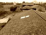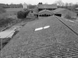Drone view of an old asbestos roof seen on a farm building, prior to being removed. The shed is used to house livestock during the winter months.