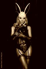 Sexy girl in erotic lingerie and Venetian mask is posing on dark velvet background.