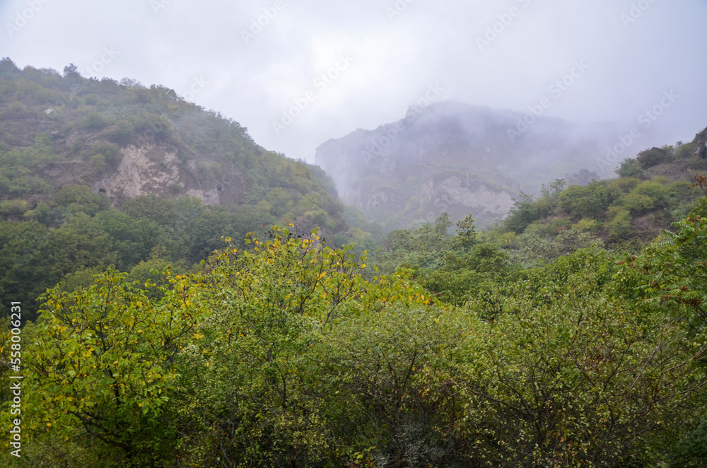 Steep slopes of a deep gorge covered fog of the Cave city Khndzoresk, one of the most impressive and mysterious places in Armenia