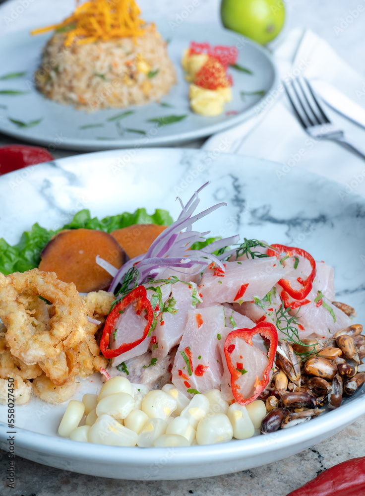 Fotografías de platos de ceviche carretillero la mesa de un restaurante en el norte del Perú