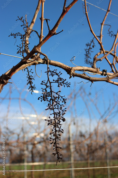 Pinot Vineyard on winter season with dried stalks against blue sky