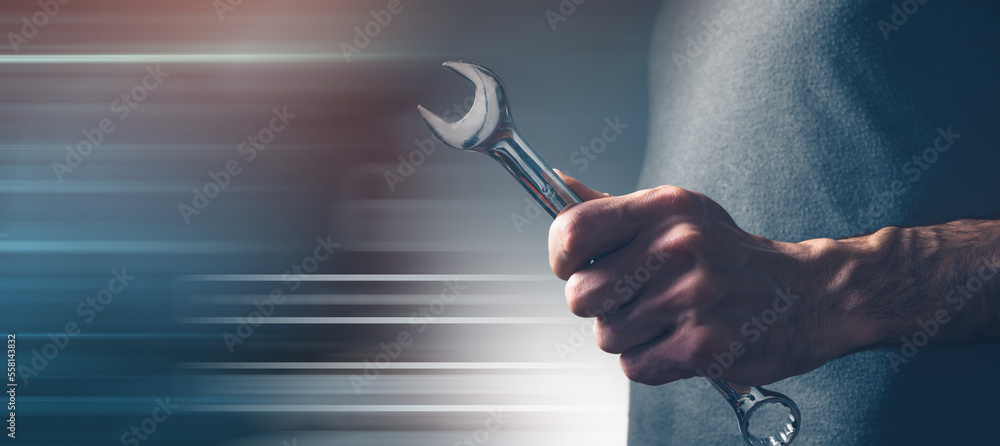 Hand wrench and Service icon from lines, triangles and particle style design.