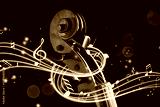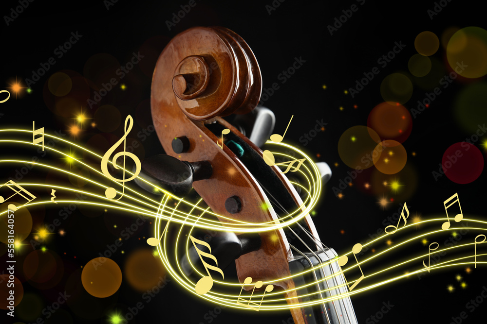 Staff with music notes and symbols braiding violin head on black background, closeup. Bokeh effect