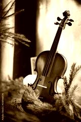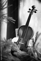 Vintage retro violin on a table, decorations, Christmas trees, candles, fabulous atmosphere