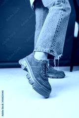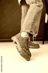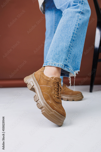 Close-up of female legs in jeans and brown casual suede sneakers. Women's summer shoes
