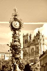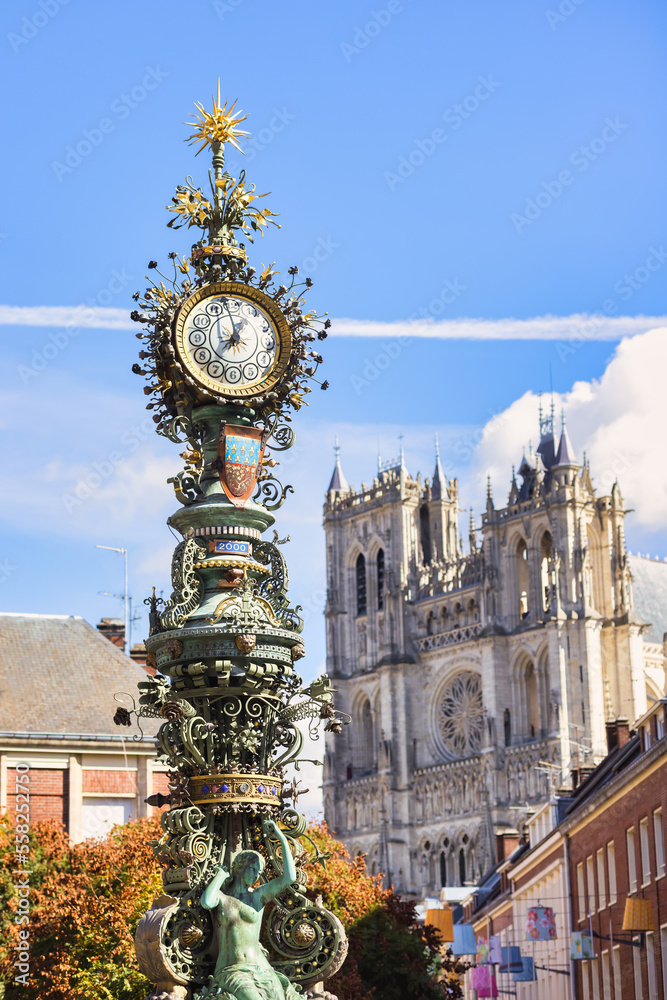 old street clock in front of Amiens Cathedral, Hauts-de-France, France