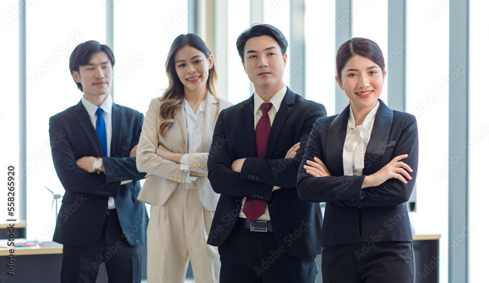 Millennial Asian young professional successful male female businessmen businesswomen in formal suit standing smiling side by side smiling in company office workstation.