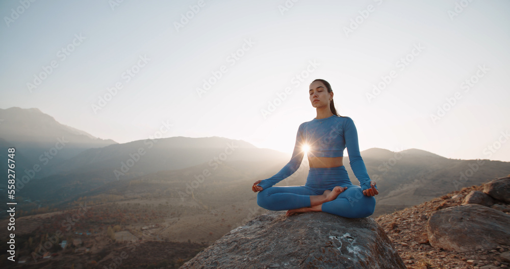 Fit girl doing lotus pose. Young athletic woman meditating in mountains, training and relaxing during sunrise - active lifestyle, zen concept