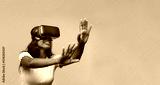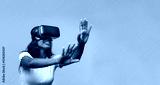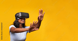 Young indian woman wearing virtual reality simulator gesturing on yellow background. Horizontal banner.