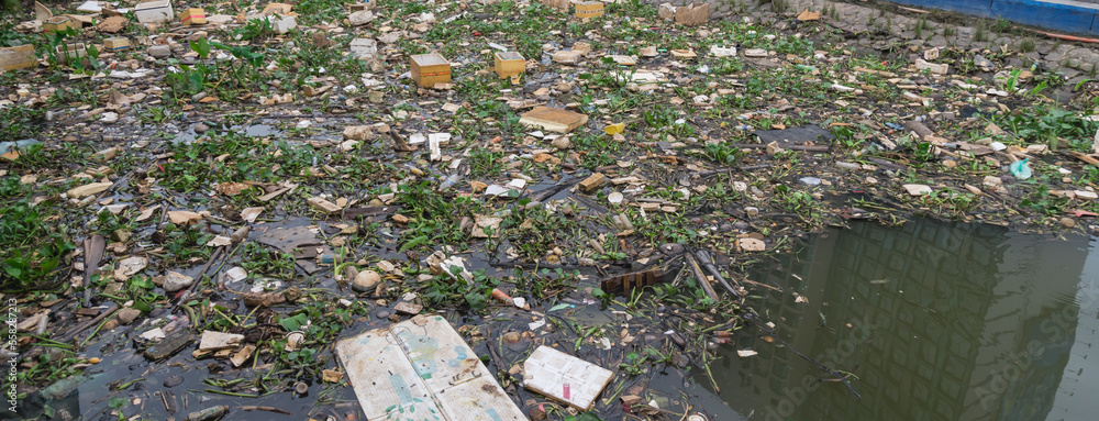 Panorama pollution in the Saigon river near pier on Bach Dang Wharf blanketed in plastic bottles, styrofoam boxes, cups