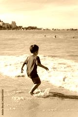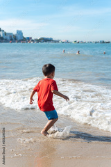 Healthy 4 year old Asian toddler boy in red t-shirt and short playing with waves on sandy shoreline at Vung Tau beach, Vietnam